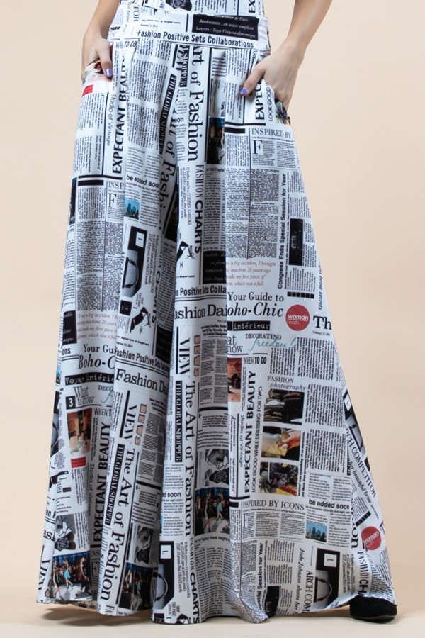 Description: Newspaper print graphic, wide leg, elastic waist bend (waist: 49 inch) pocket detail wide skirt pants. Palazzo pants.