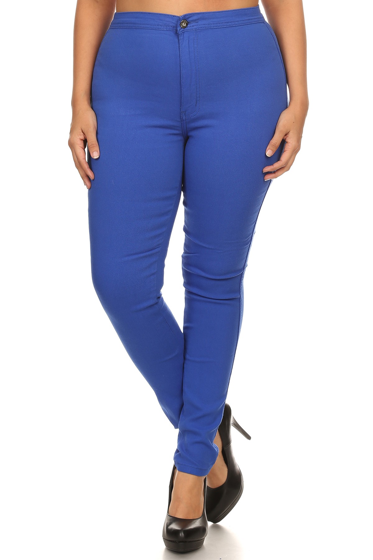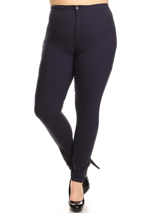 Description: Solid, full length jeans in a slim fitting style with a buttoned closure and a high waist. 2 back pockets.