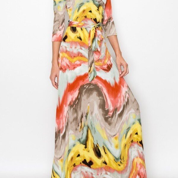 Venechia print 3/4 sleeve maxi wrap dress, 95% Polyester 5% Spandex.